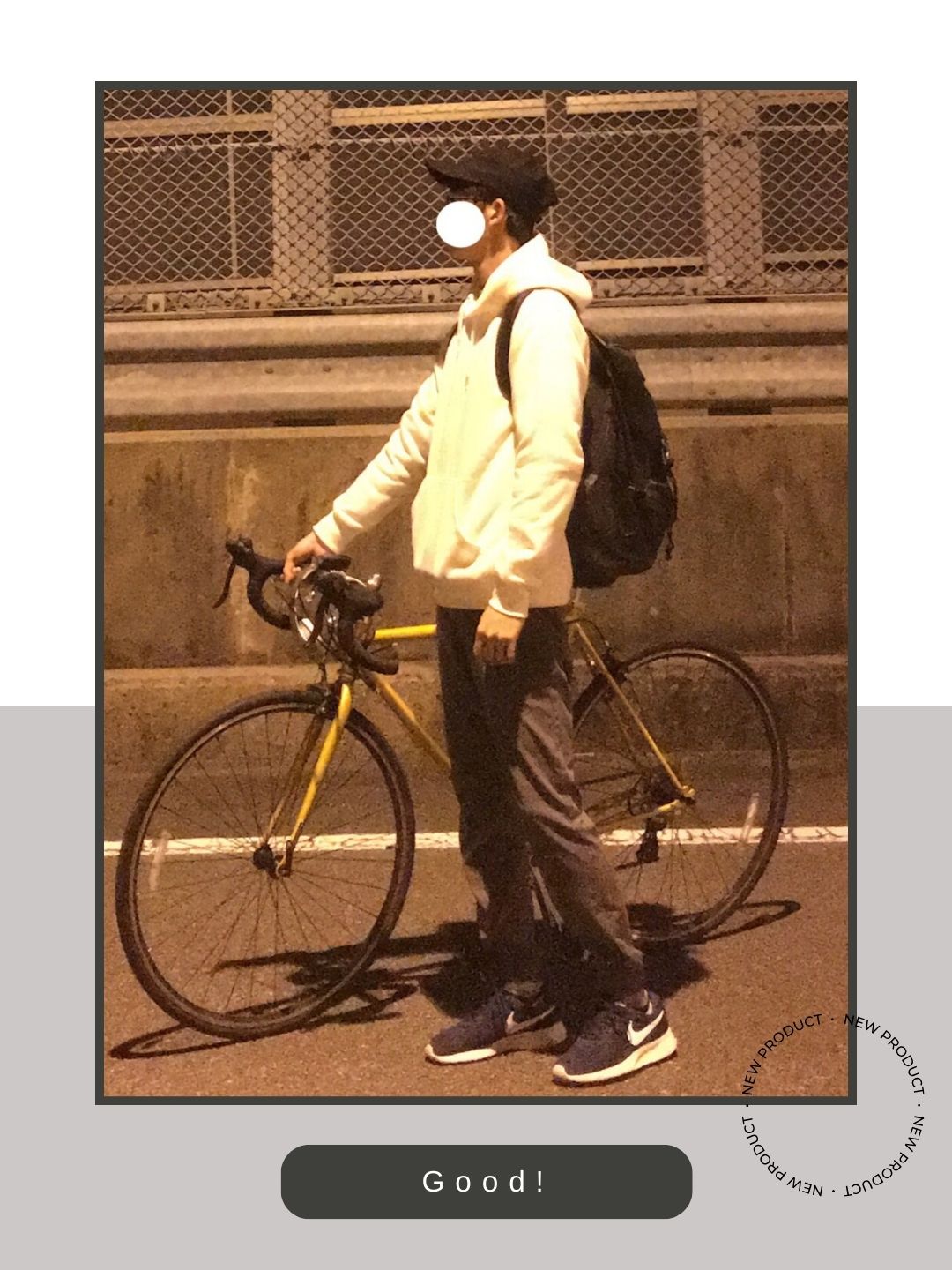 白のフーディーというクリーンなトップスに対し、余計な装飾を一切排除したタンジュンのシンプルなシルエットが機能美を感じさせるスタイリッシュな足元を演出しています。スニーカーのボディとスウッシュ(ロゴ)のコントラストが、全身の「白・黒・グレー」のカラーパレットと完璧に同調しており、都会的で洗練された印象を与えています。