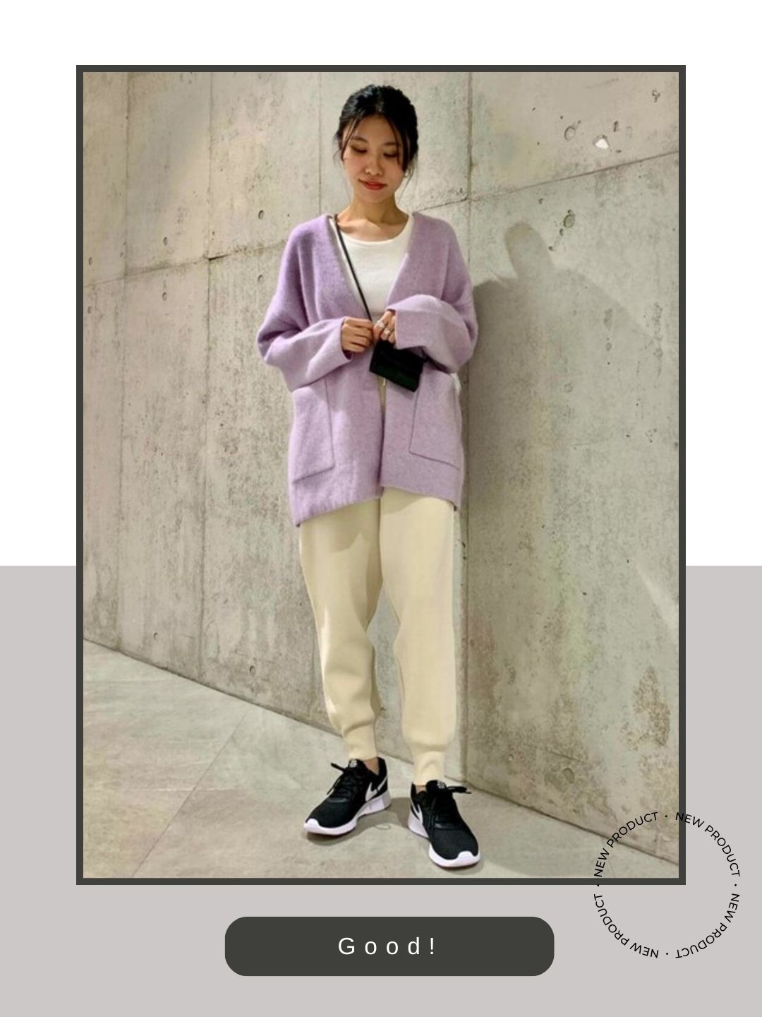 カーディガンやパンツに明るいペールトーンを採用した膨張色のコーディネートに対し、足元にブラックのタンジュンを配置することで、全体の印象をキリッと引き締めています。淡い色調だけでまとめるとぼやけがちなシルエットが、足元の黒によって重心が安定し、都会的で洗練された佇まいに昇華されています。