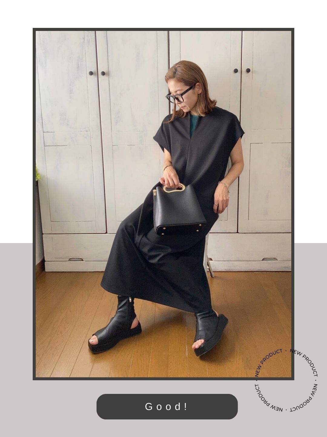 くるぶしまでを覆う黒のロングワンピースは一歩間違えると重たい印象になりがちですが、つま先と踵(かかと)が大きく開いたオープントゥ×バックストラップのデザインがその重さを完璧に解消しています。ブーツのボリュームを維持しつつ肌を効果的に露出させることで、全身にリズムと軽やかな「抜け感」をもたらしています。
