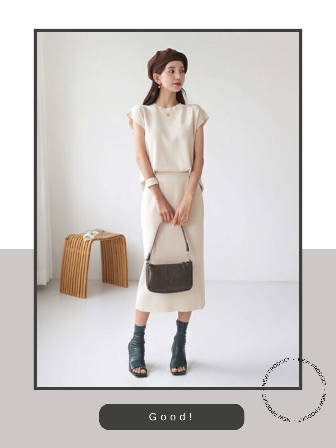 つま先のカットが直線的なスクエアソールになっていることでセットアップの柔らかい雰囲気に都会的なエッジを加えています。優しげなベージュトーンの装いを足元の鋭い造形がキリッと引き締め、甘すぎない「自立した大人のエレガンス」を完成させています。