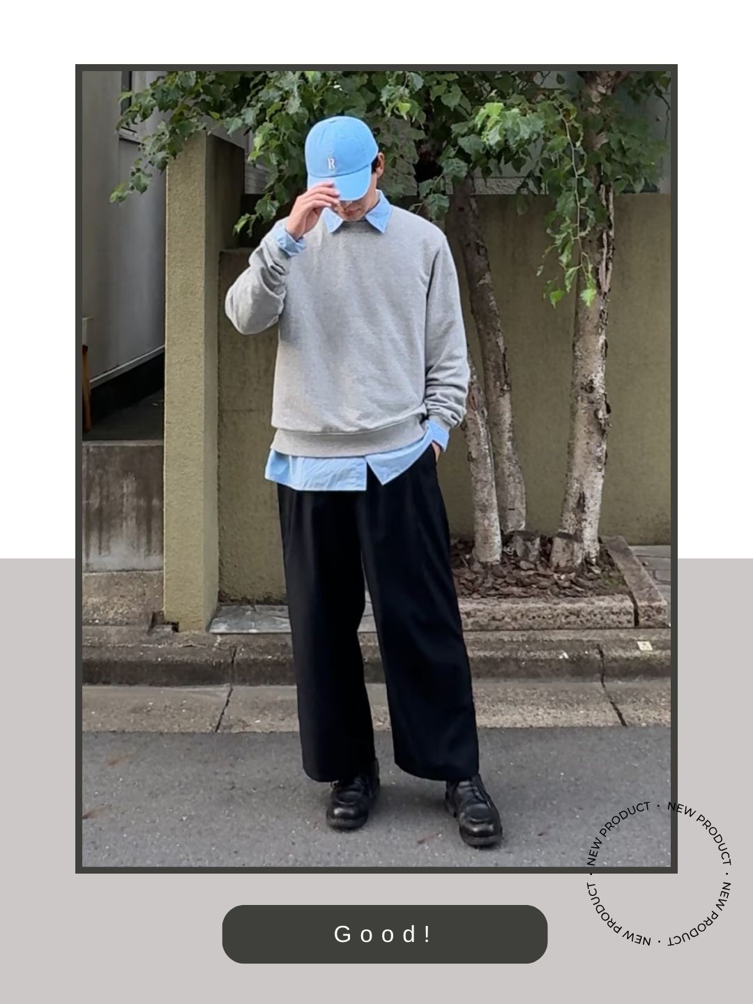 グレーのスウェットにシャツをレイヤードしたリラックス感のあるトップスに対し、足元に程よくボリュームのあるシャンボードを持ってくることで、着こなしがルーズになりすぎず、都会的な印象に引き締まっています。
