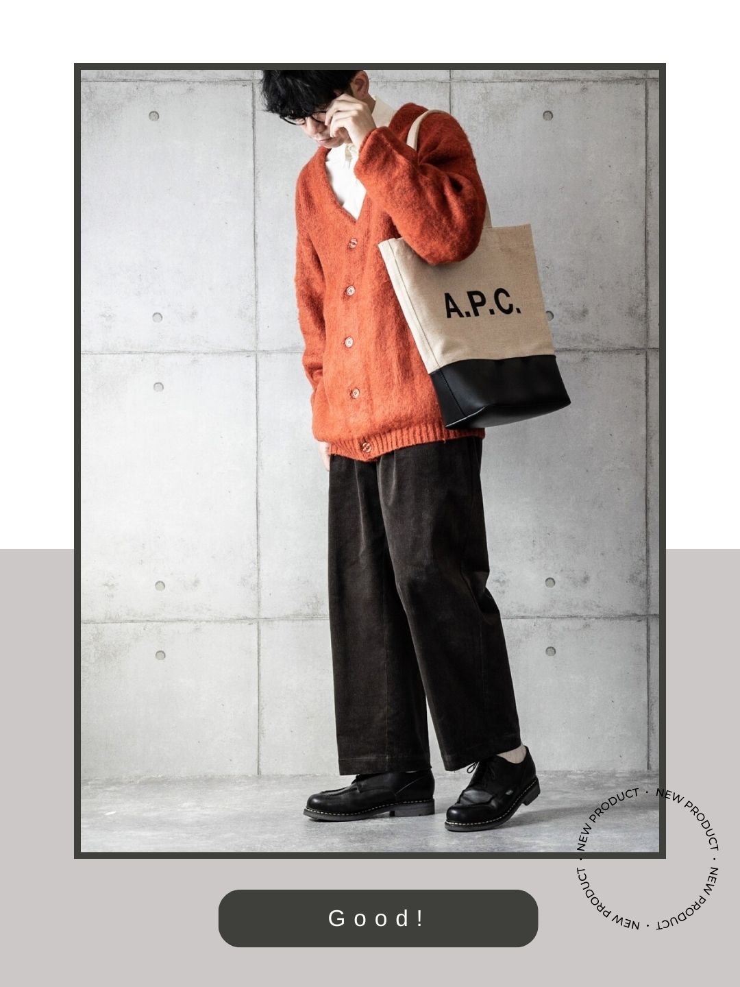 | 10-20代 | ハイエンドなスケーター風 | 膝にダメージのあるブラックデニムに、オーバーサイズのネルシャツを羽織るスタイル。足元にスニーカーではなく、あえて艶のあるシャンボードを置くことで、ルーズな服を「意図的なお洒落」に引き締める着こなしです。 |