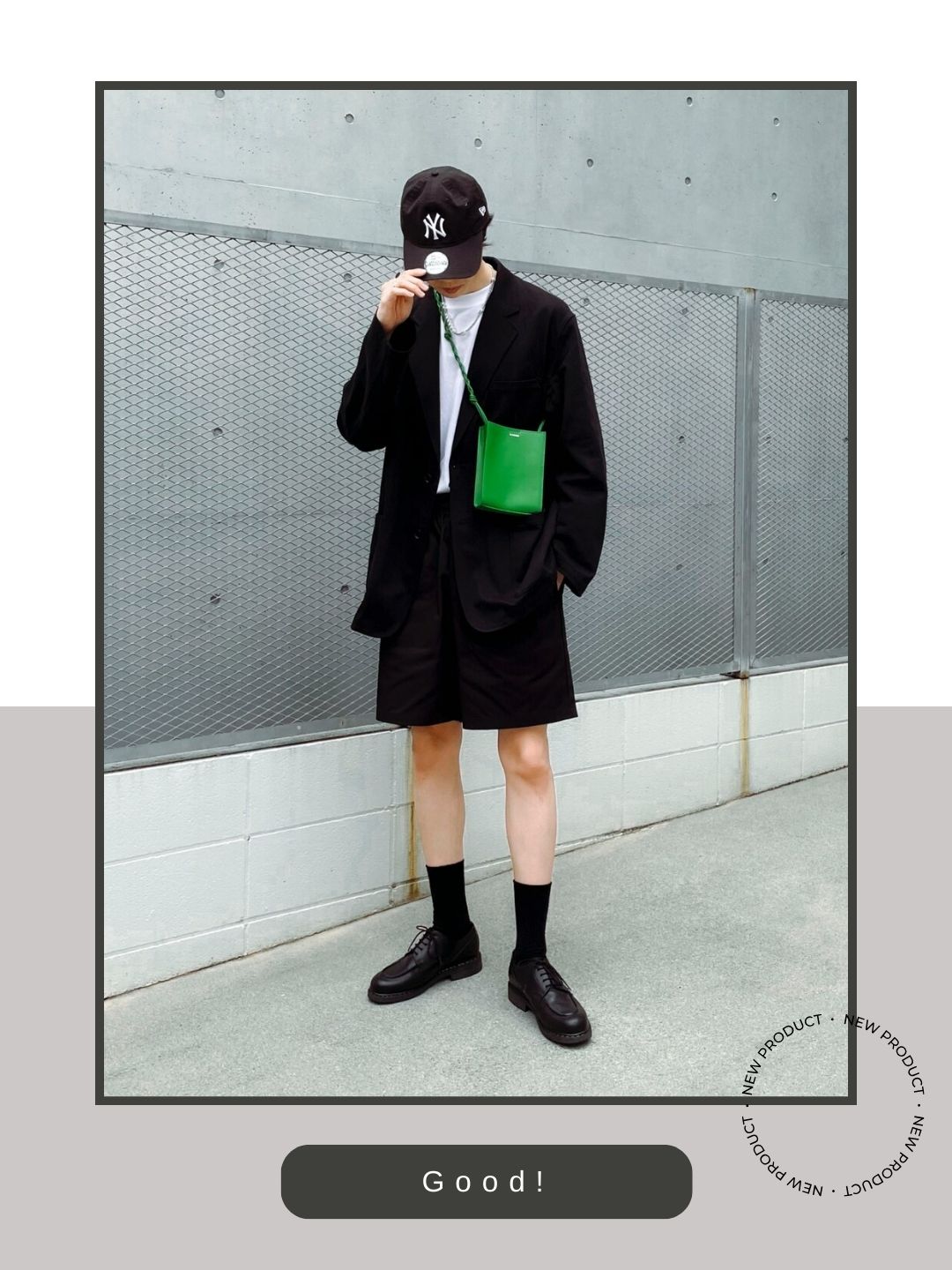 黒のミドル丈ソックスとシャンボードを繋げることで、足元に視覚的な「重み」を持たせています。これにより、ショーツスタイル特有の子供っぽさを完全に払拭し、都会的な大人の装いへと昇華させています。