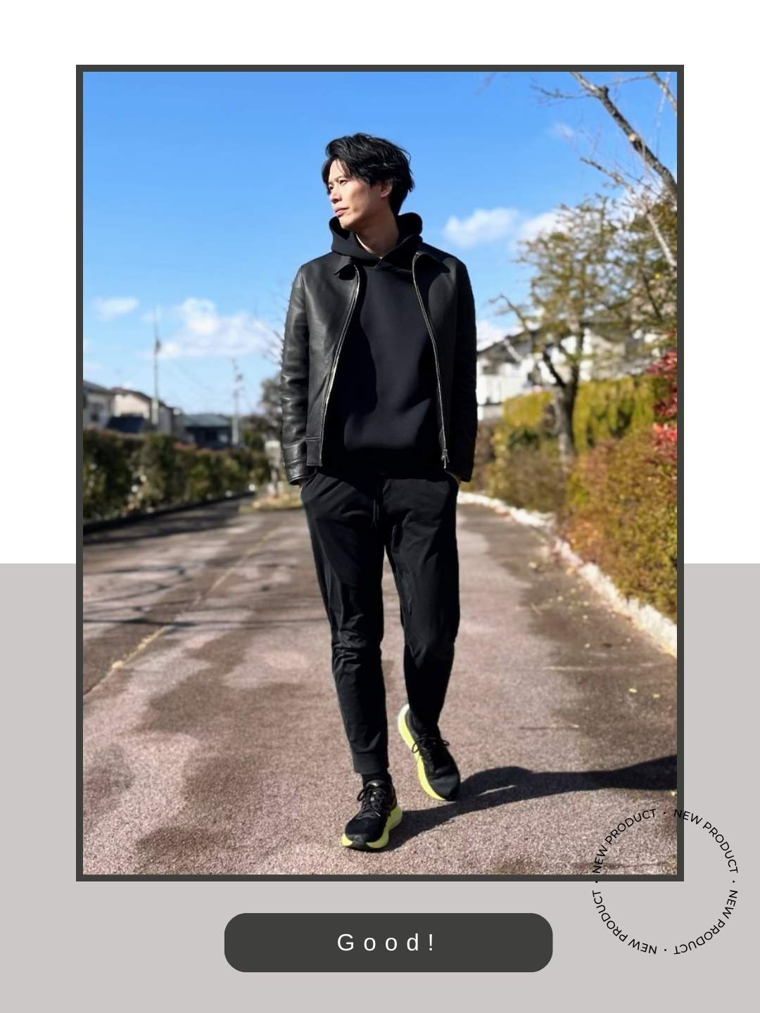 | 30-40代 | 「質感」で馴染ませるワントーン | ブラックのスラックス + 黒のテクニカルジャケット。 全身を黒系で統一し、ランニングシューズのメッシュやリフレクターの質感をアクセントにする。洗練された都会のモード・スタイル。 |