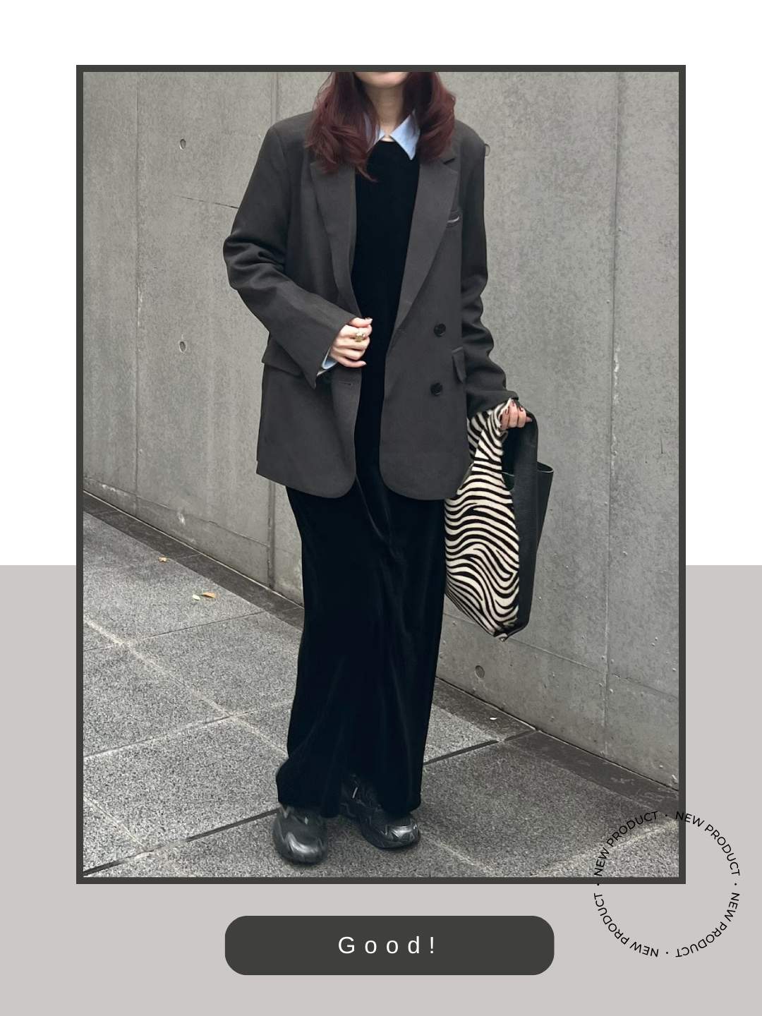 重厚感のあるダブルジャケットとエレガントなマキシ丈ワンピースという、フォーマル寄りな組み合わせに対し、あえてハイテクなランニングシューズを合わせることで、絶妙な「ハズし」を効かせています。この大胆なミックス感が、カッチリしすぎない大人のこなれ感を生み出しています。