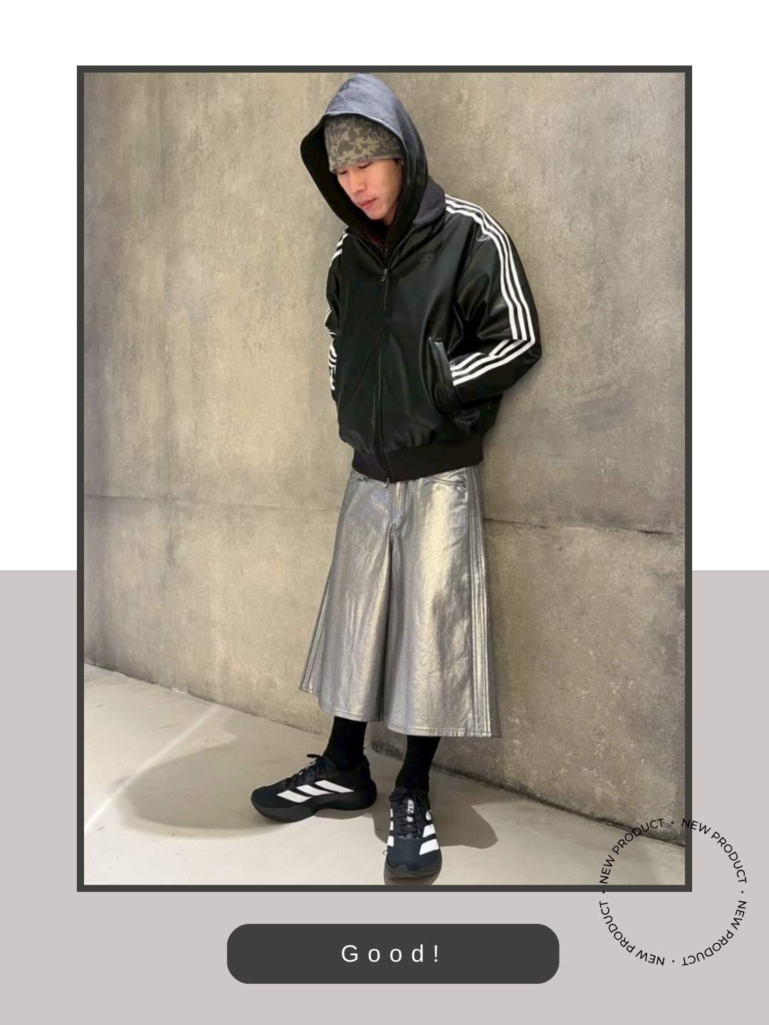 レザーのような光沢のあるトラックジャケットと、シルバーのメタリックパンツという非常にエッジの効いた組み合わせに対し、足元にアディダスのランニングシューズを合わせることで、全体を「スポーツ」という軸で綺麗にまとめています。この選択が、個性の強いアイテム同士を反発させず、洗練されたストリートスタイルへと昇華させています。