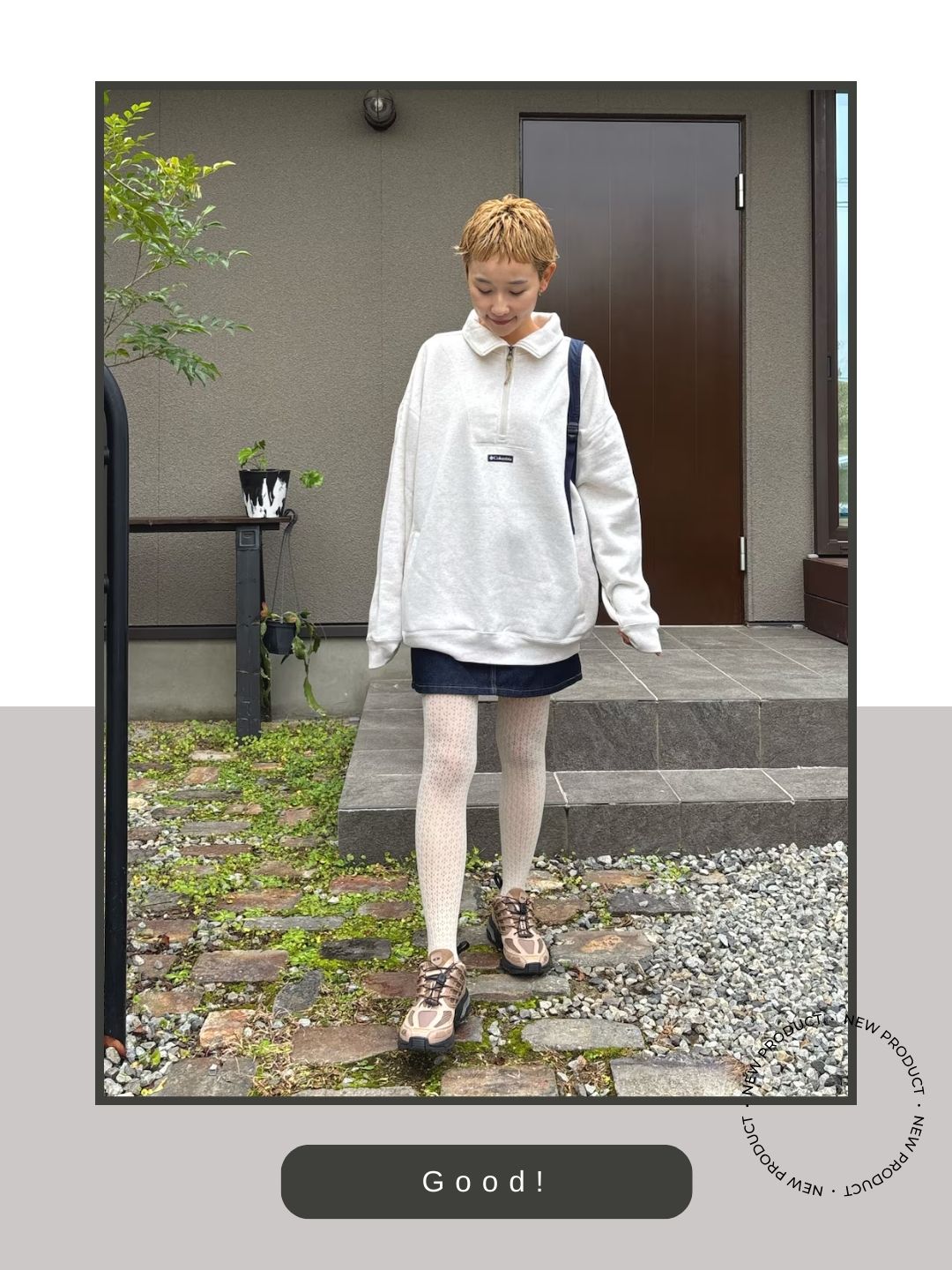 ミニスカートとレースタイツという非常に甘い要素に対し、無骨なテックシューズを置くことで甘さを抑えた「大人のスポーツミックス」を実現しています。華奢なパンプスやローテクスニーカーではなくパーツの重なりが複雑なSALOMONを持ってくることで、足元に今どきなボリューム感とモードなスパイスを加えています。